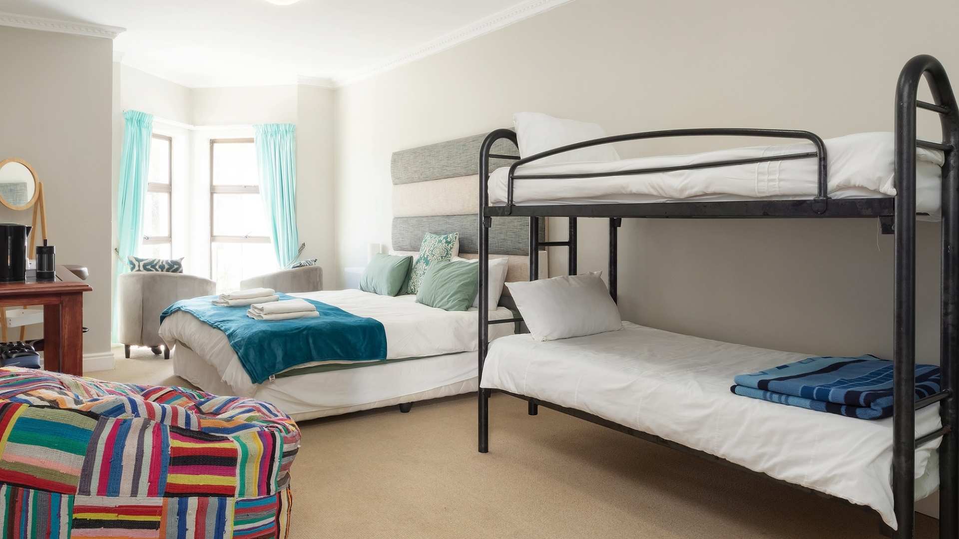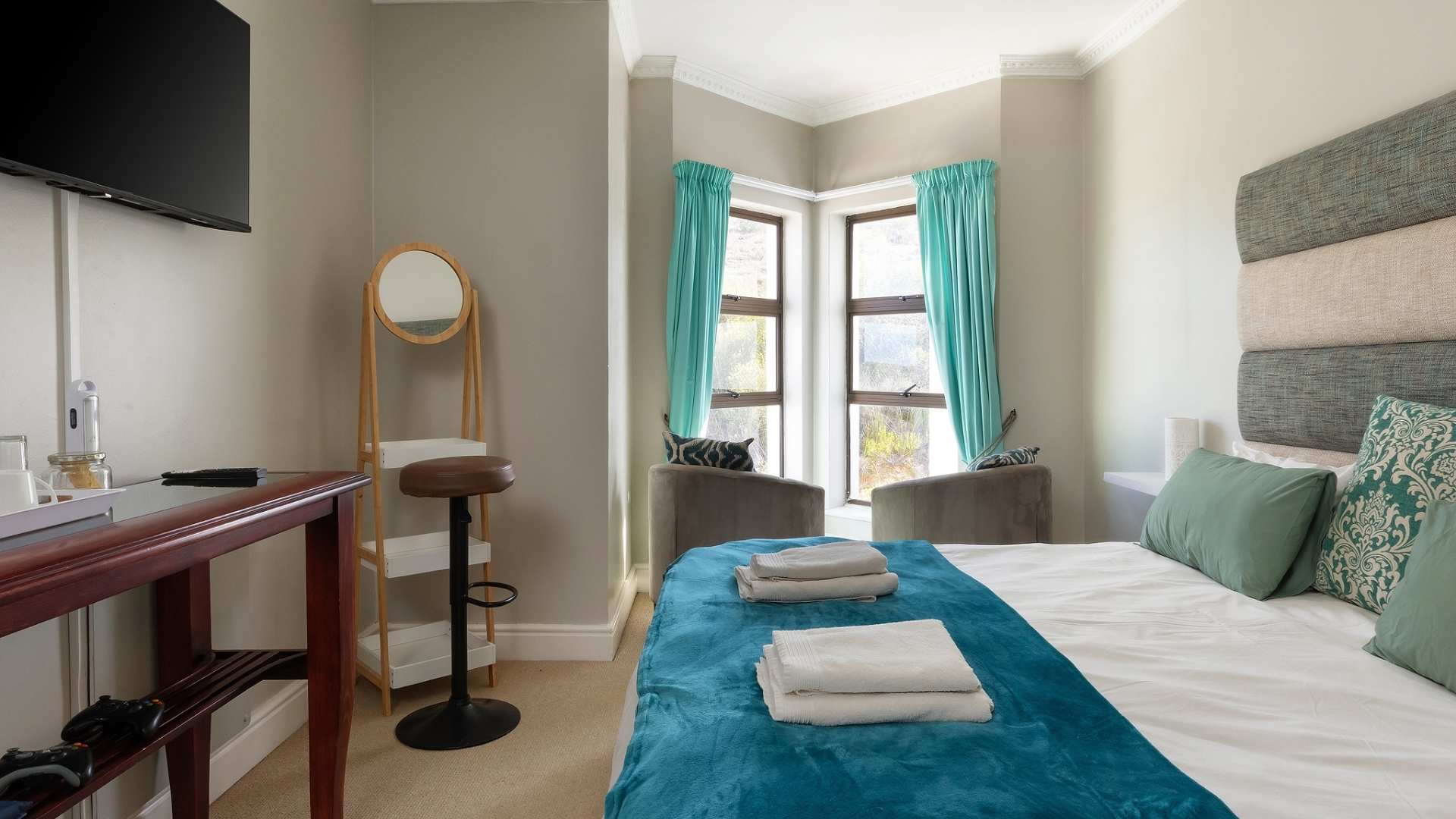 Featuring vibrant colours and traditional African decor, the Kenyan Room (up to two guests) creates a warm and inviting atmosphere. The spacious and comfortable room allows guests to relax and unwind in style. The large windows in the room offer breathtaking views of the entire Mossel Bay